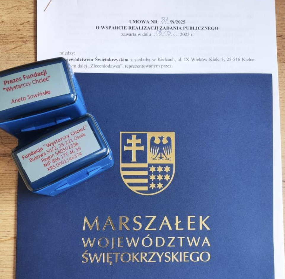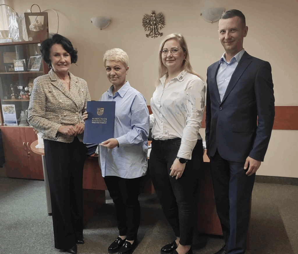 W dniu 8.05.2025 została podpisana umowa o wsparcie realizacji zadania publicznego pomiędzy Województwem Świętokrzyskim reprezentowanym przez Panią Elżbietę Korus – Dyrektor Regionalnego Ośrodka Polityki Społecznej w Kielcach, a naszą Fundacją, którą reprezentowała Pani Aneta Sowińska – Prezes Fundacji.